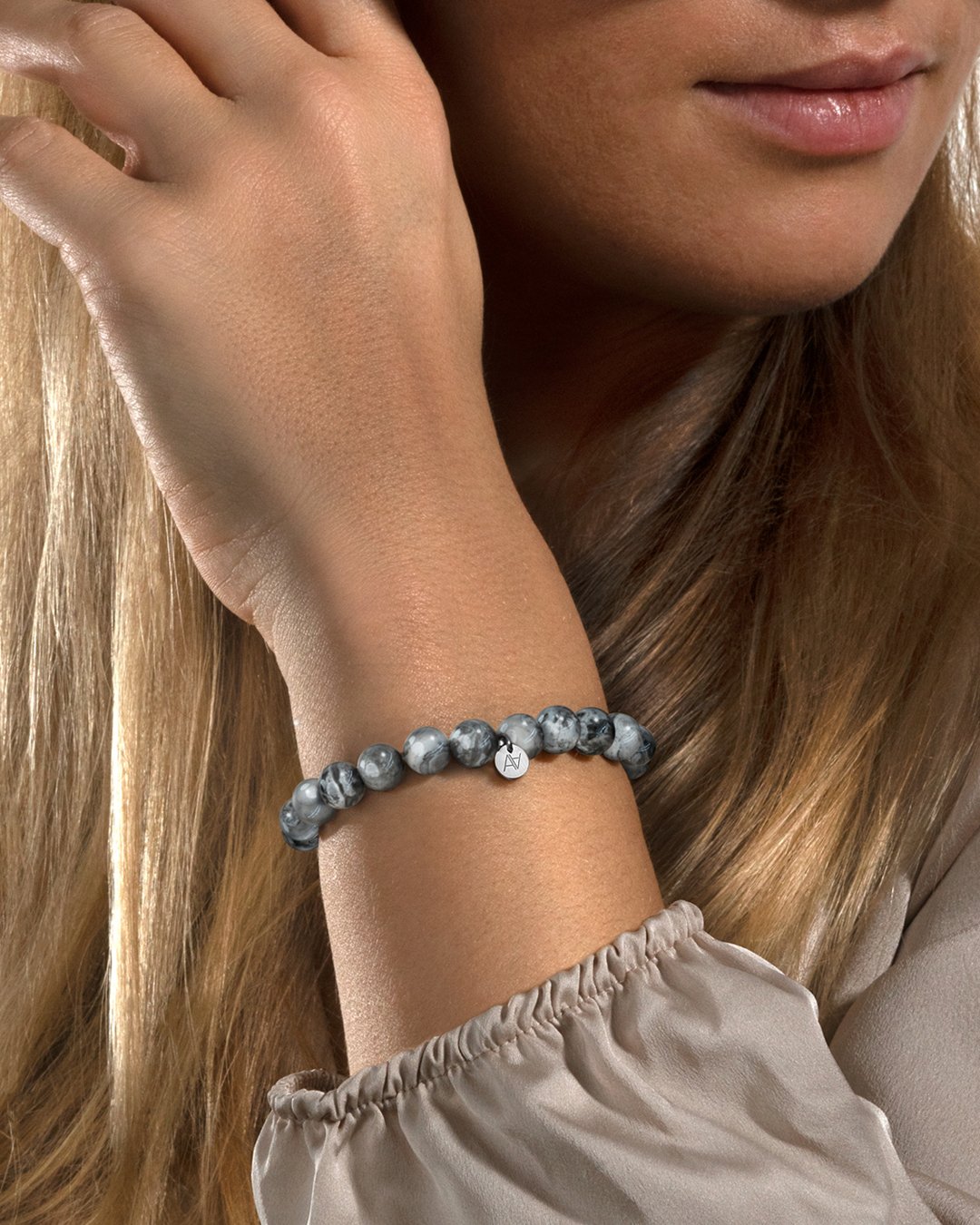 Das Armband Giulia ist aus grauem Achat Crazy Lace gefertigt. Das Armband besteht aus 8 mm großen Natursteinen und ist mit einer von Anna Velazia signierten Pastille verziert. Die Pastille ist aus Edelstahl gefertigt.
