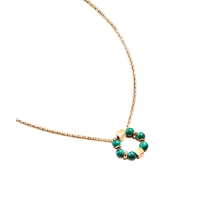 Das Armband Umbria besteht aus einer zarten rosévergoldeten Edelstahlkette, die in der Mitte von einem floralen Motiv aus Malachit veredelt wird, verflochten mit einem gehämmerten Ring aus roséfarbenem Edelstahl.