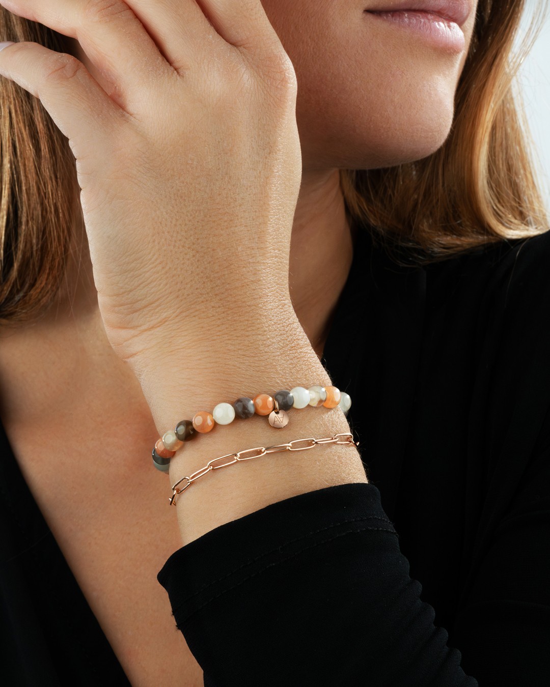 - Material des Armbandes Rosévergoldeter Edelstahl und mehrfarbiger Mondstein