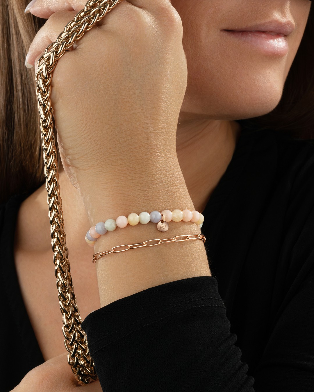 - Material des Armbandes Rosévergoldeter Edelstahl und Morganit