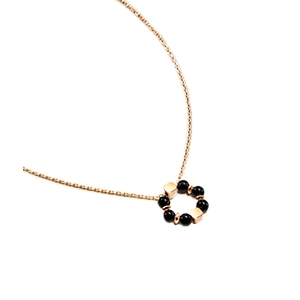 Das Armband Nerona besteht aus einer zarten rosévergoldeten Edelstahlkette, die in der Mitte von einem floralen Motiv aus Onyx veredelt wird, verflochten mit einem gehämmerten Ring aus roséfarbenem Edelstahl.