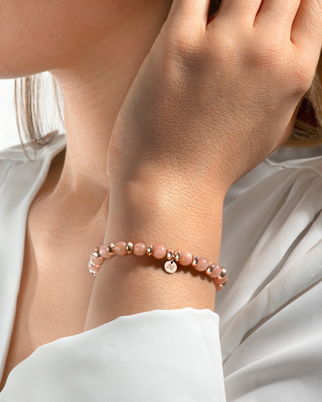 - Material des Armbandes Rosévergoldeter Edelstahl und Sonnenstein