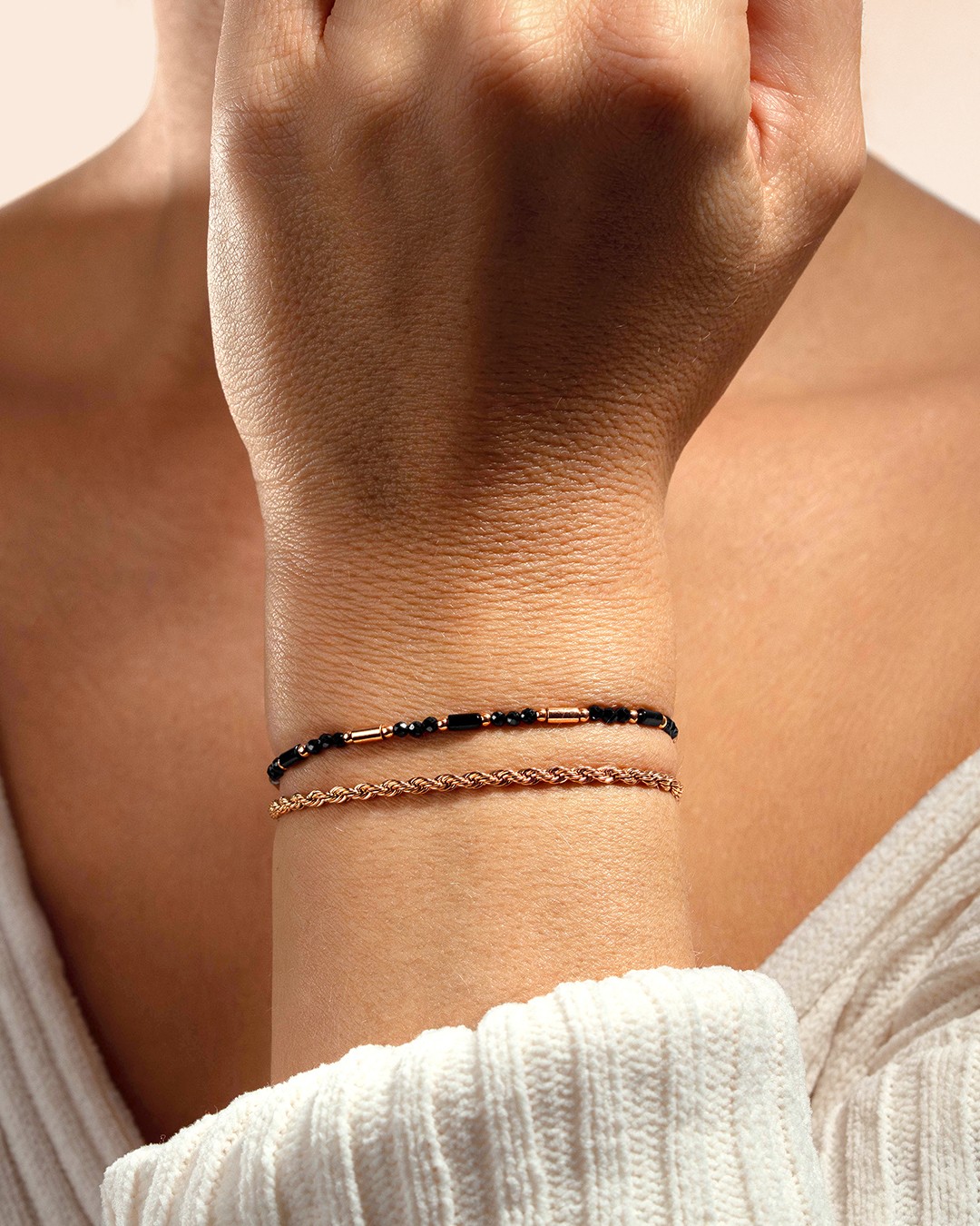 Das Portofina-Armband besteht aus facettierten Perlen aus Schwarzer Turmalin, bekannt für ihre schützenden und erdenden Eigenschaften, sowie aus Schwarzer Achat-Röhren, einem Stein, der für seine Fähigkeit geschätzt wird, innere Stärke und Stabilität zu verleihen.