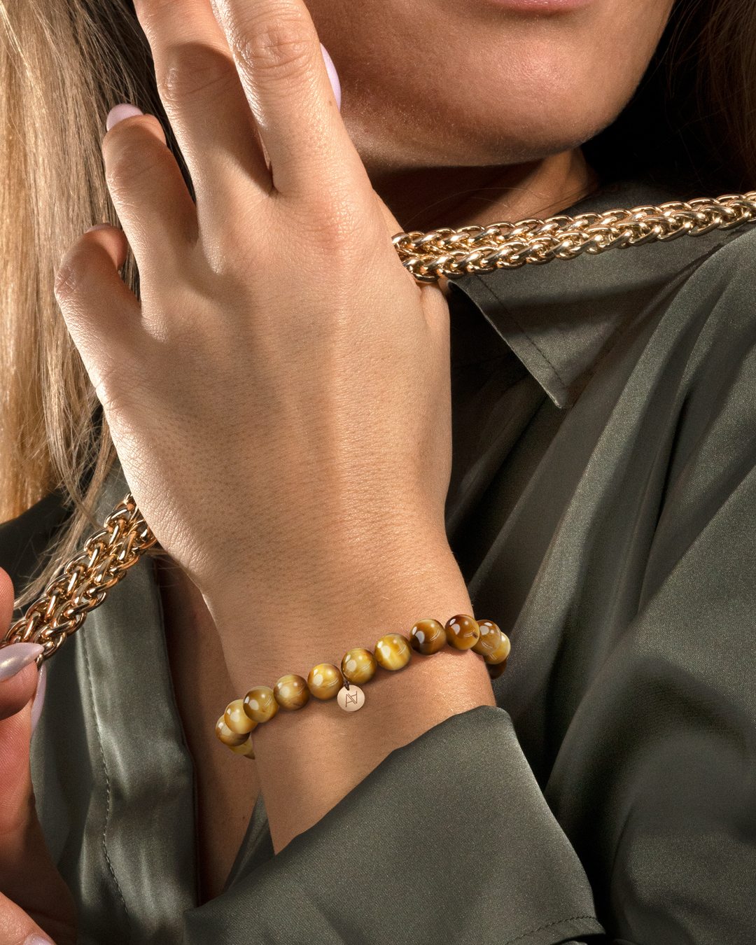 Das Armband Sicilia ist aus wunderschönen vergoldeteten Tigerauge. Das Armband besteht aus 8 mm großen Natursteinen und ist mit einer von Anna Velazia signierten Pastille verziert. Die Pastille ist aus rosévergoldetem Edelstahl.