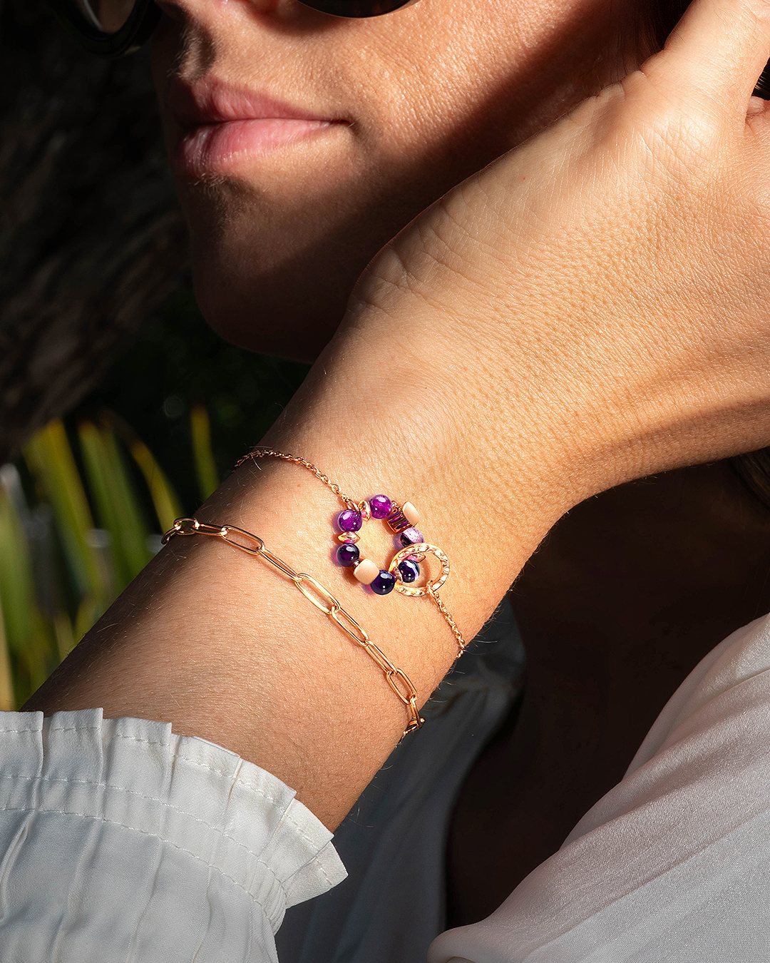 Das Armband Porpora besteht aus einer zarten rosévergoldeten Edelstahlkette, die in der Mitte von einem floralen Motiv aus violettem Achat veredelt wird, verflochten mit einem gehämmerten Ring aus roséfarbenem Edelstahl.