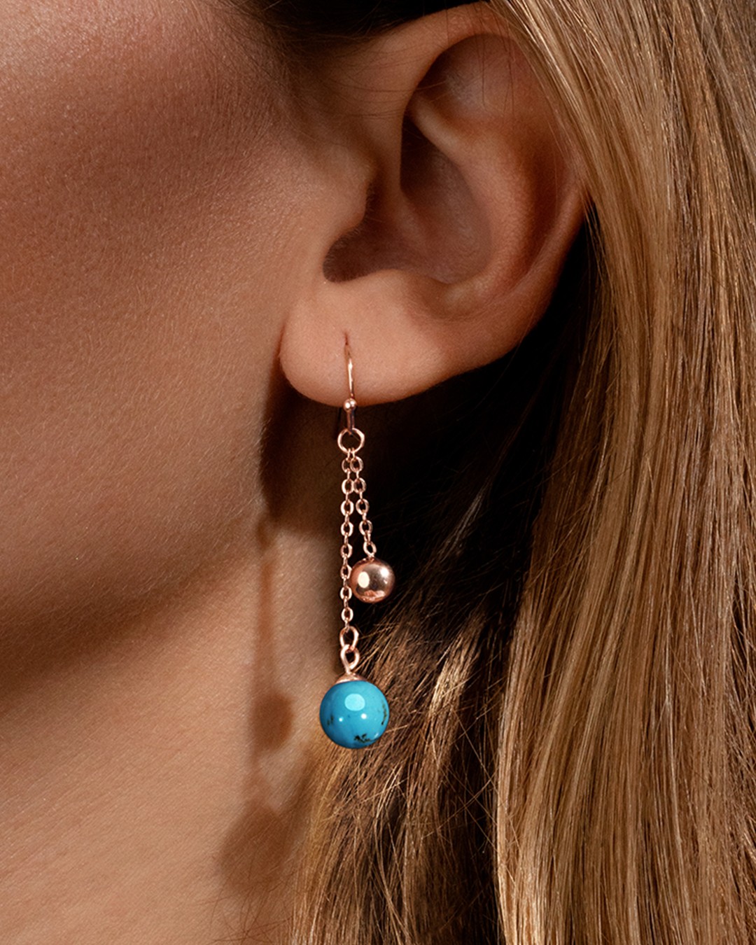 Die Ohrringe Atraniti sind mit einem Türkisstein und einer Kugel aus roséfarbenem Edelstahl verziert, die elegant herabhängen.In der Steinheilkunde ist Türkis für seine harmonisierende bzw. schützende Wirkung bekannt und soll die Kommunikation fördern.Unsere Schmuckstücke bestehen aus Natursteinen und sind daher alle unterschiedlich. Daher kann es je nach Modell zu Abweichungen in der Größe und den Farbnuancen kommen. Diese Unterschiede machen jeden Stein zu einem Unikat.