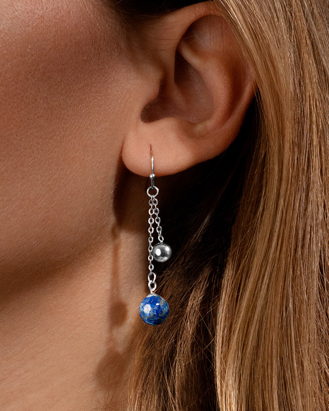 Die Ohrgehänge Gimelli sind mit einem Lapislazuli-Stein und einer Kugel aus Edelstahl verziert, die zierlich aufgehängt sind.