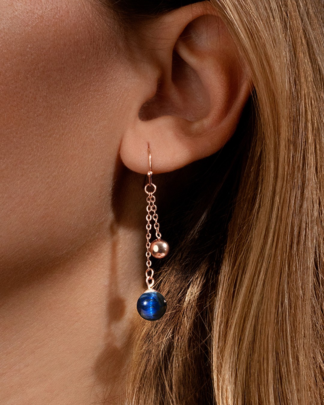 Die Ohrringe Olmeti sind mit einem blauen Tigeraugenstein und einer rosafarbenen Kugel aus roségoldenem Edelstahl verziert, die elegant herabhängt. In der Steinheilkunde ist das blaue Tigerauge für seine Eigenschaften bekannt, das Selbstvertrauen zu stärken, die Kommunikation zu verbessern sowie Ruhe und Gelassenheit zu verleihen. Unsere Schmuckstücke bestehen aus natürlichen Steinen und sind daher alle unterschiedlich. Daher kann es je nach Modell zu Abweichungen in der Größe und den Farbnuancen kommen. Es sind diese Unterschiede, die jeden Stein einzigartig machen.