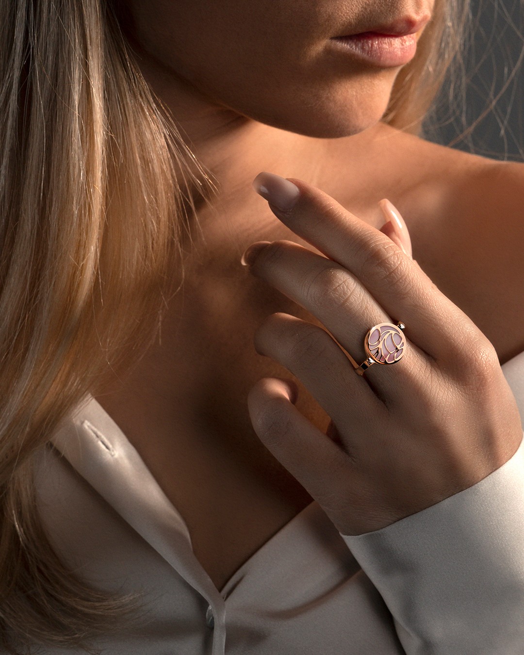 Der Ring San Felina Rosa ist aus roséfarbenen Edelstahl und mit Perlmutt verziert.