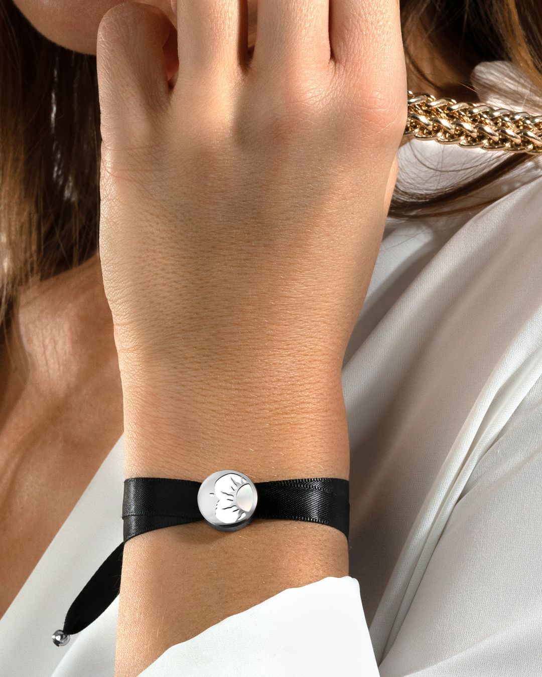 Das Plättchen "Passionio Bianco" erfindet sich neu. Es ist auf einem eleganten schwarzen Satinband angebracht.